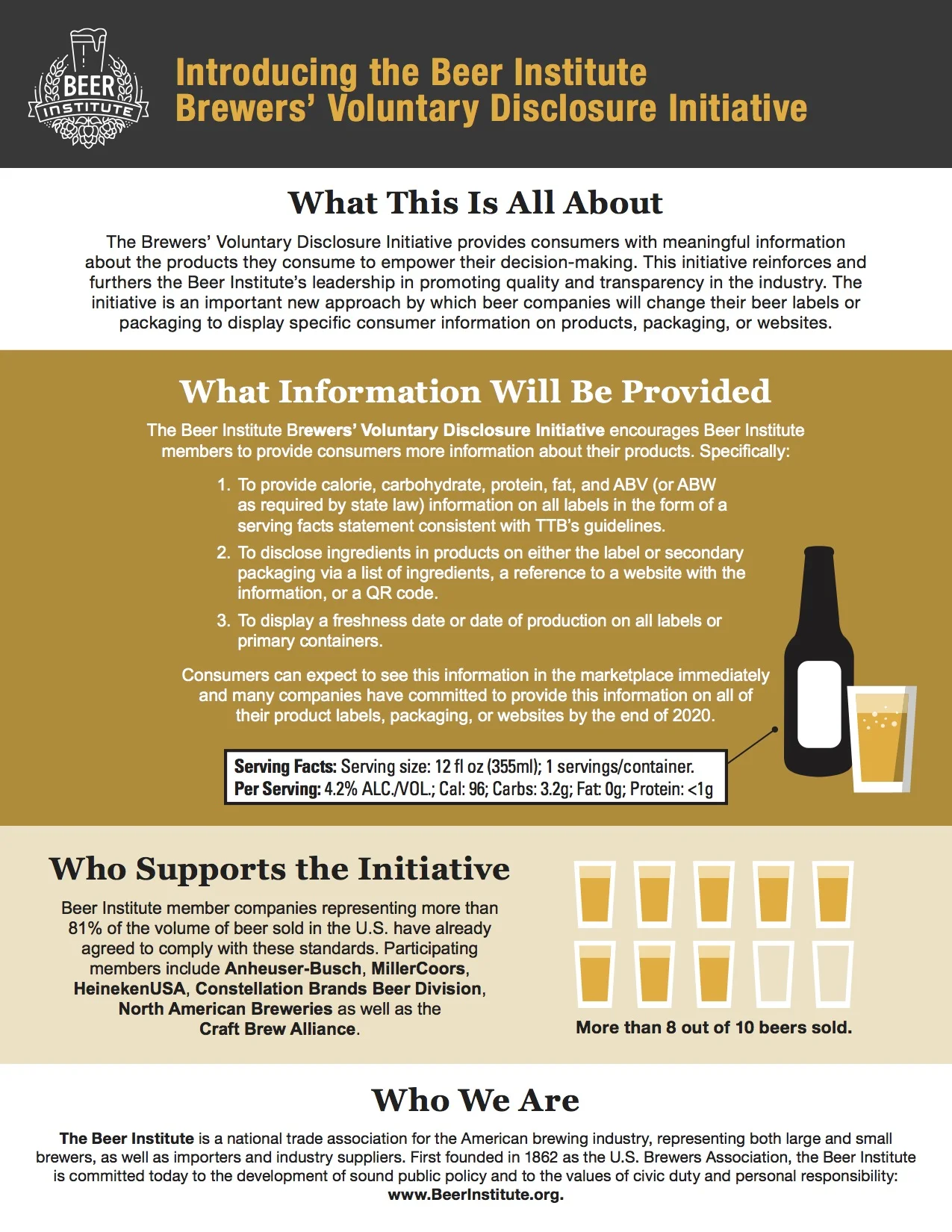 In July 2016, the Beer Institute announced that several beer manufacturers, including Anheuser-Busch, will voluntarily list nutritional information on beers by 2020. This decision is known as the Voluntary Disclosure Initiative. Voluntary because the Alcohol and Tobacco Tax and Trade Bureau doesn't require alcohol manufacturers provide this information.